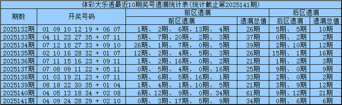 凡哥体彩大乐透第2025142期前区五区遗漏分析:(定义:遗漏0-3期号码为热码,遗漏4-9期号码为温码,遗漏10期及10期以上号码为冷码)