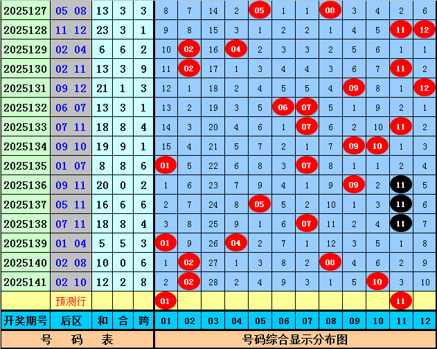 后区奖号分析:上期后区奖号为02+10,遗漏期数为0期和6期,目前后区号码01-12分别遗漏:2期、0期、28期、2期、4期、9期、3期、1期、5期、0期、3期、10期,本期后区注意号码01、04、09、10、11,两码关注01、11。