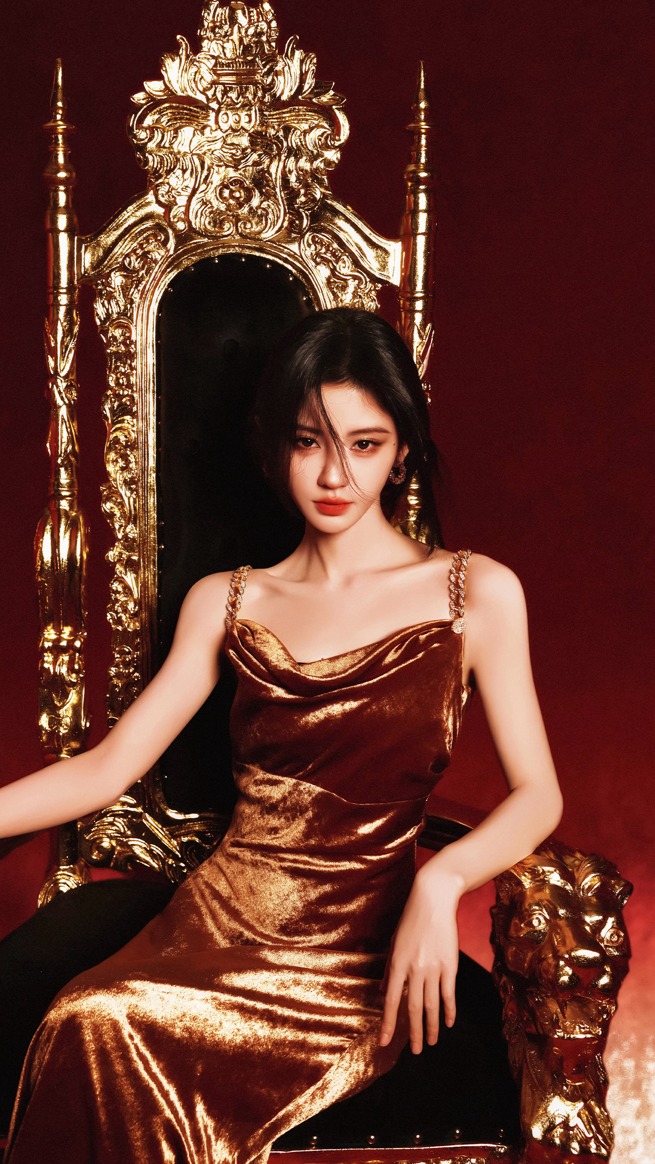 这组写真简直像从电影《黑天鹅》和《爱丽丝梦游仙境》的交界处偷来的灵感。深邃丝绒包裹着她的肩线,像夜色一样沉静又神秘;而那抹鎏金点缀,则如破晓时分的第一缕光,瞬间点亮整张画面。更绝的是脚下那块经典棋盘格——黑白分明,步步为营,仿佛在说:“别惹我,我可是掌控全局的女王。”这不是拍照,这是下棋,而她,是执子之人。