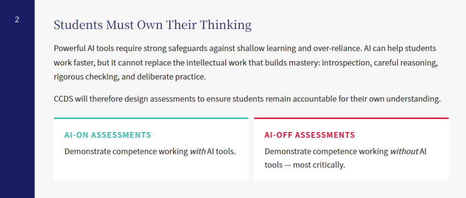 教育考核方面,并非一刀切地禁用 AI,作为先行军的计算机与数据科学学院 (CCDS) 设计了一种解决方式,即 AI-ON 和 AI-OFF 评估体系。
