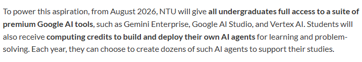 而 NTU 不分文理工商,从 2026 年 8 月起,所有本科生将获得 Google 全套高级 AI 工具的全面访问权限,包括 Gemini Enterprise、Google AI Studio 以及 Vertex AI。
